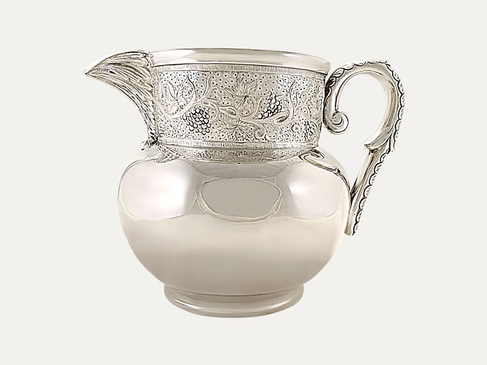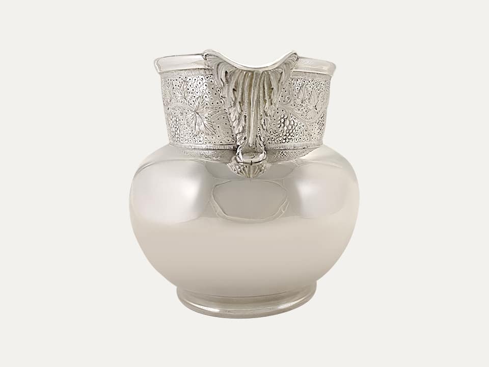 Jarro em prata 833 ‰ portuguesa decorado com barra relevada representando folhas, parras e uvas. Pegas e bicos decorados com motivos vegetalistas. Com marcas de contraste de Lisboa (íguia), Joalharia Correia. Peso 867 g; Altura 17 cm..