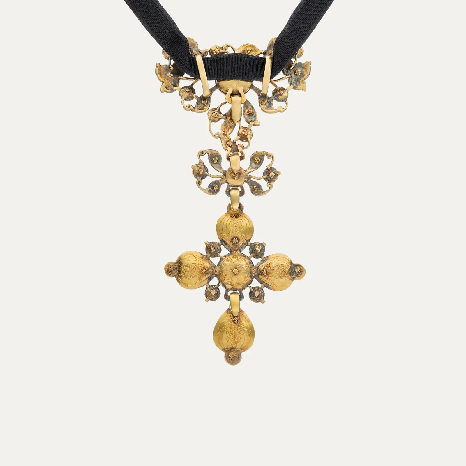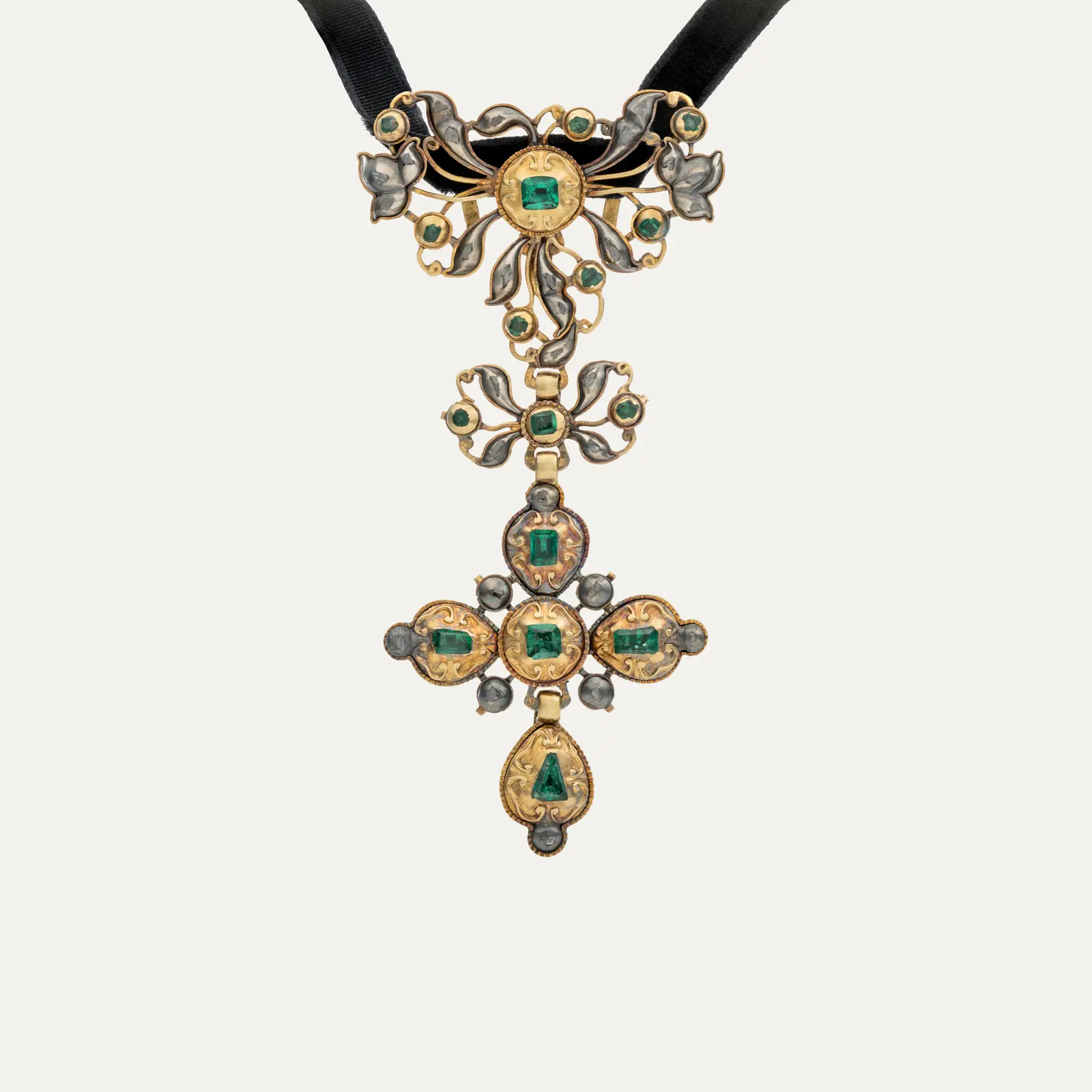 Pendente em ouro com dois elementos superiores em forma de laço, cruz central e pingente periforme, peças destacáveis. Em ouro com 16 esmeraldas e 29 diamantes cravejados sobre prata. Espanhol, séc. XVIII. Sem marcas, ao abrigo do Decreto-Lei nº 120/2017, de 15 de Setembro – art. 2º, nº 2, alínea c).