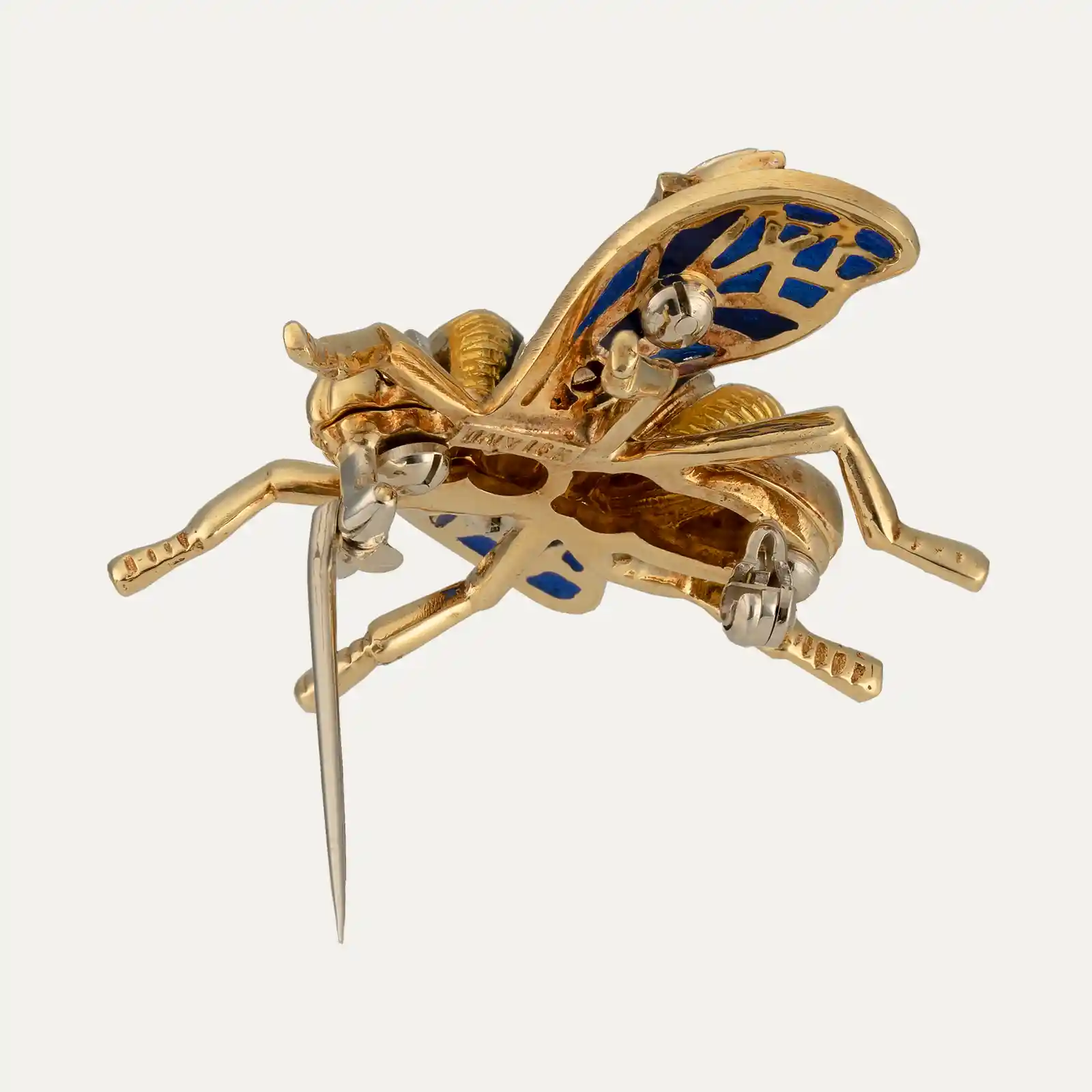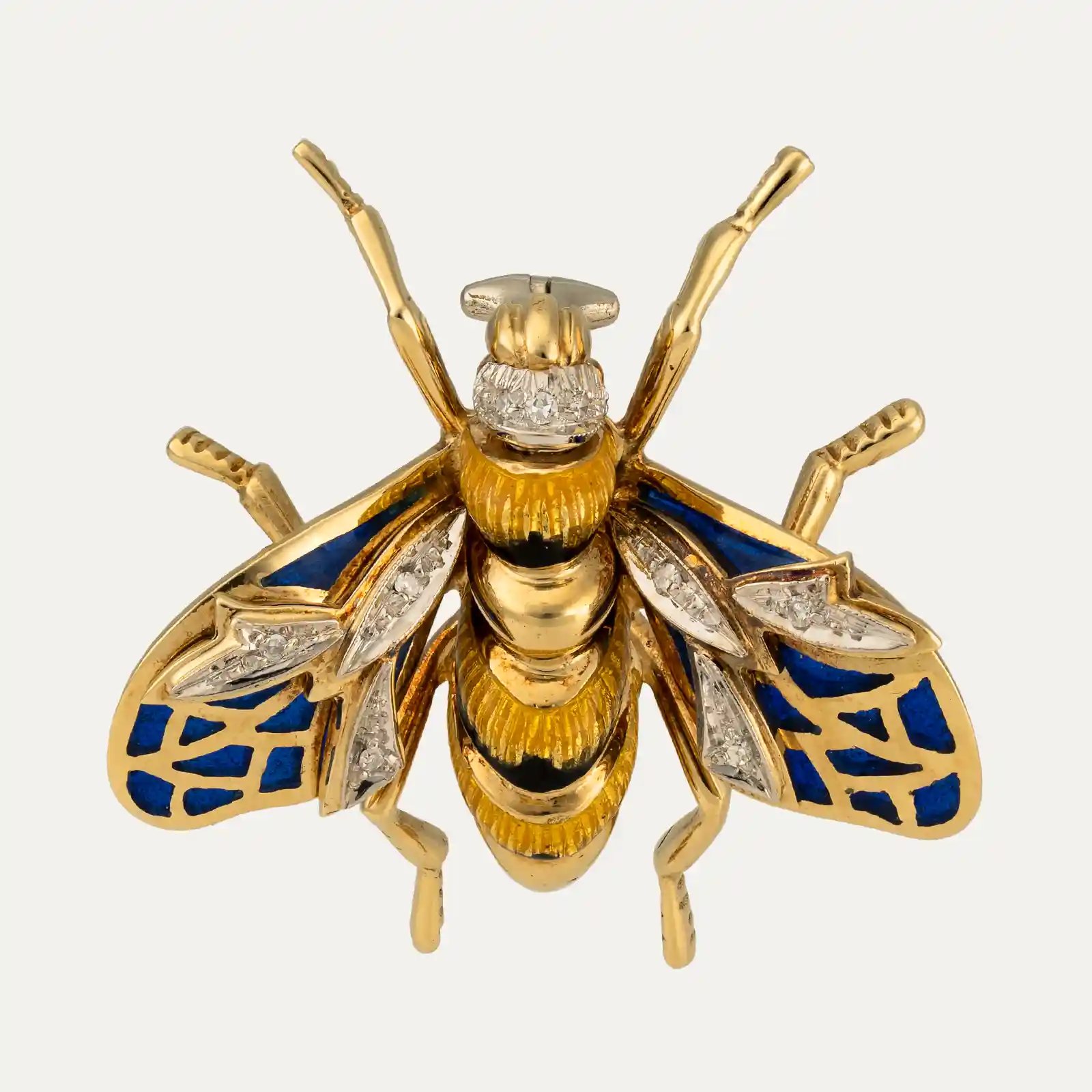Pregadeira italiana em forma de abelha em ouro amarelo de 18kt – 750‰, asas em esmalte azul “plique-à-jour” efeito vitral, cravejadas com 6 diamantes e cabeça cravejada com 3 diamantes com cerca de 0.09ct no total. Corpo adornado com esmalte amarelo e preto.