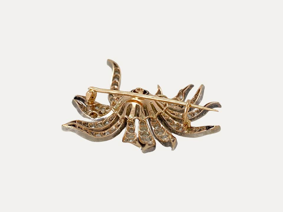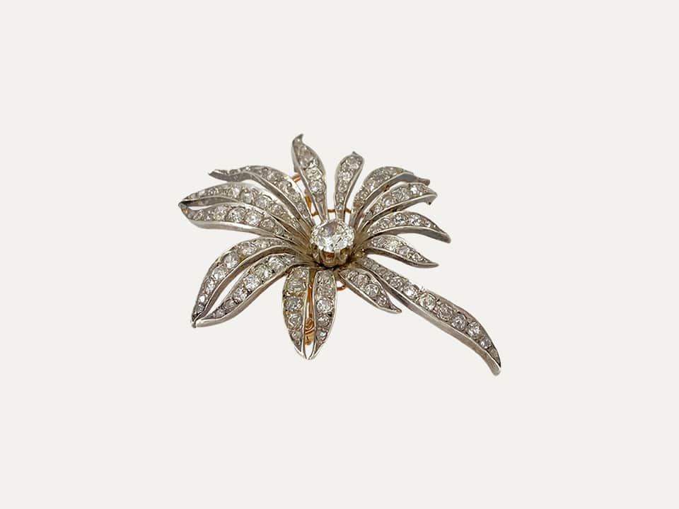 Pregadeira / alfinete em forma de flor, com brilhante ao centro (1.10 ct) e pavê de diamantes cravados nas pétalas em prata. Estrutura do fecho atrás em ouro amarelo.