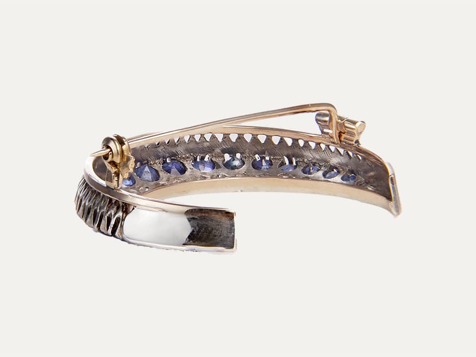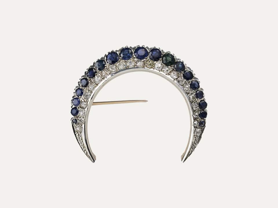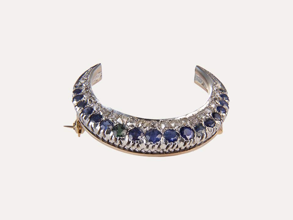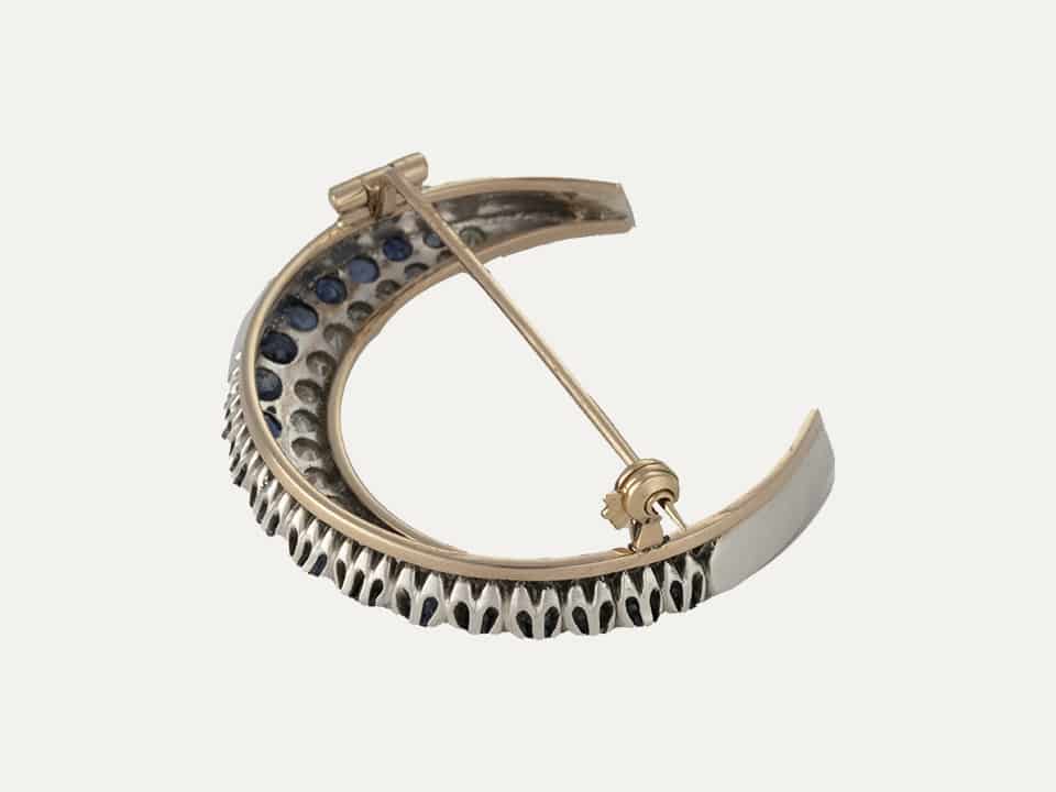 Pregadeira “Crescente”, em prata e ouro 18kt – 750‰ com 23 diamantes com 1.50ct no total e 23 safiras azuis. Sec.XIX. Estrutura do fecho em ouro rosa.