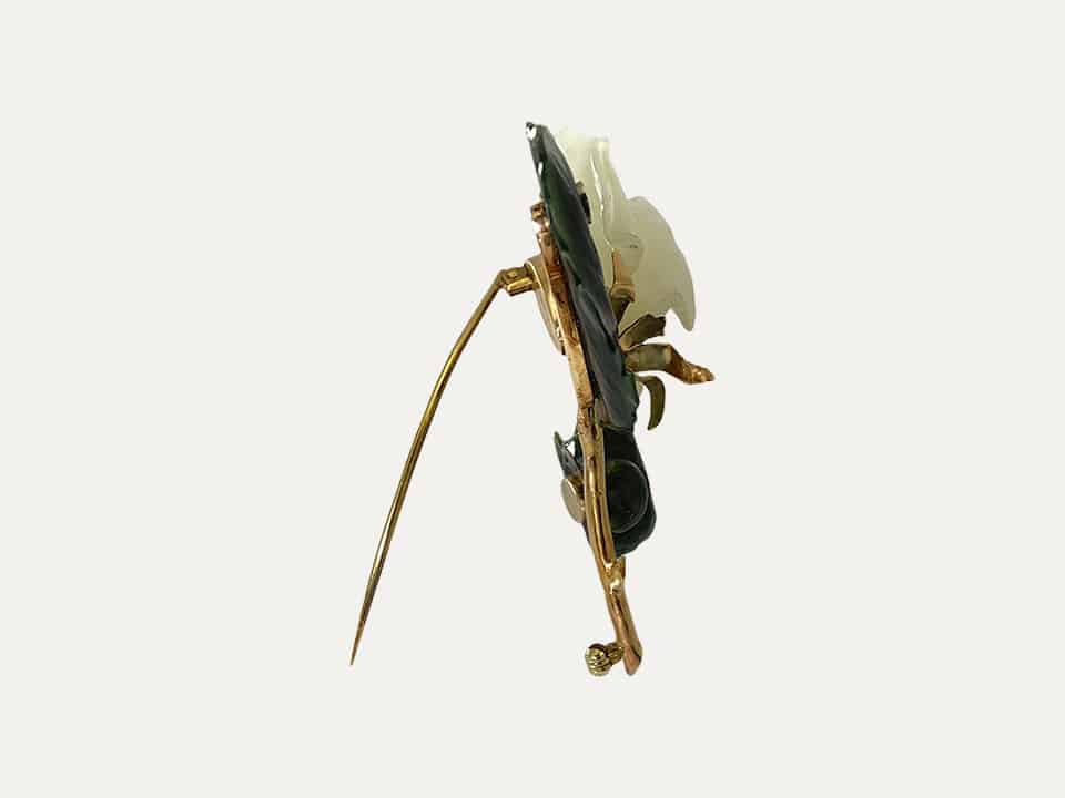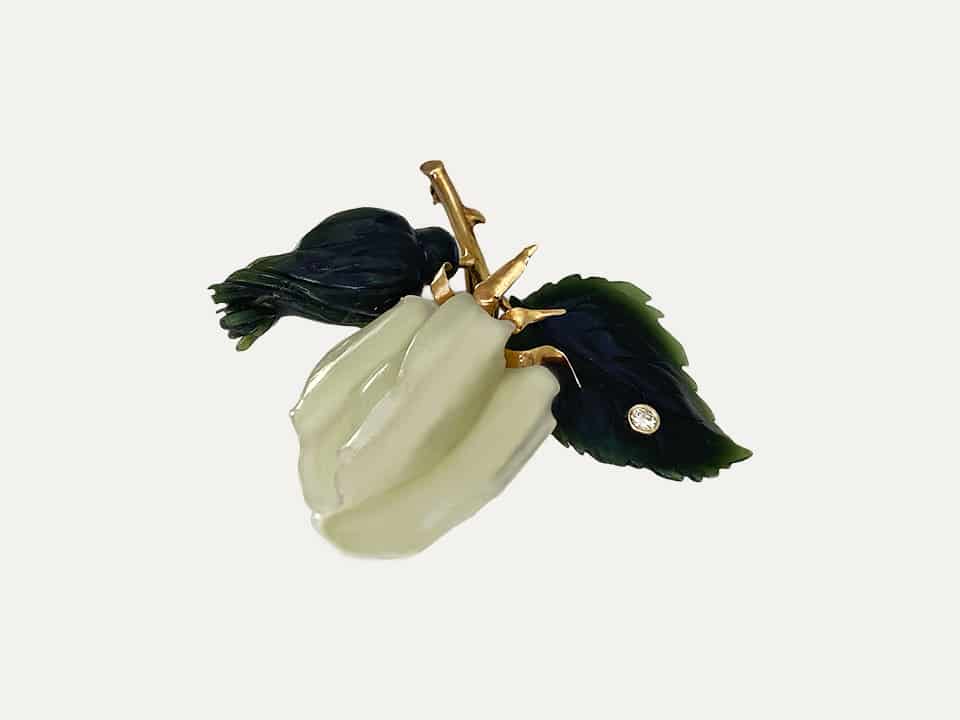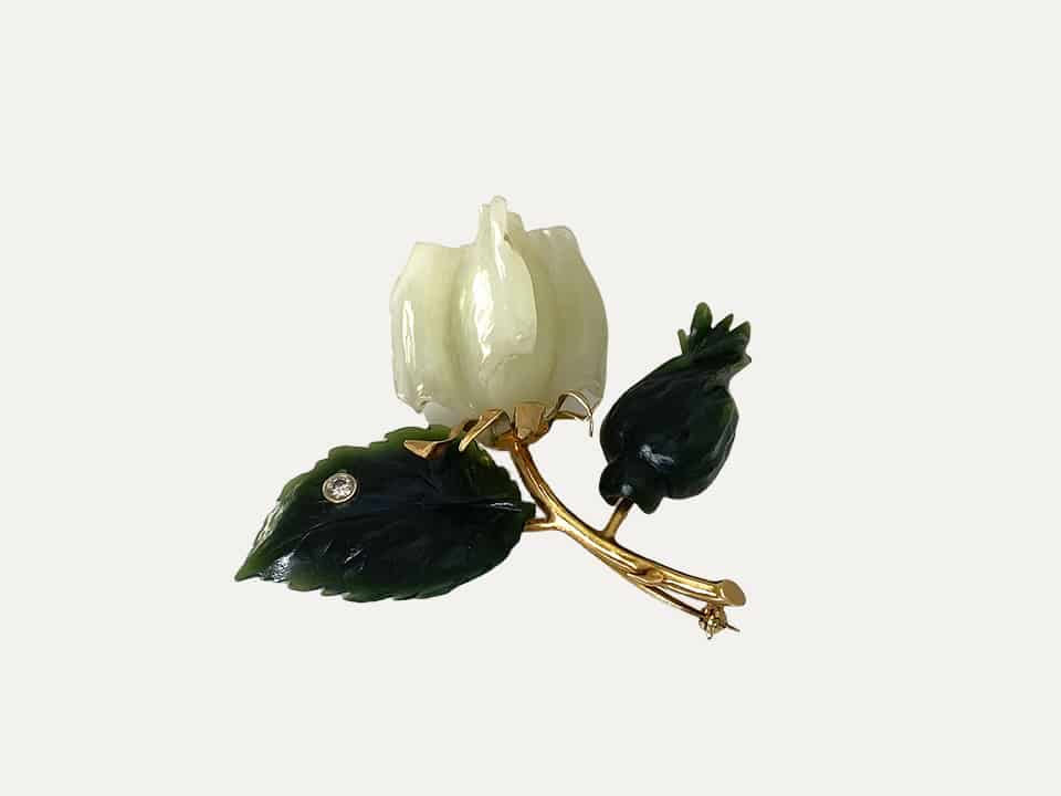 Pregadeira em forma de flôr em ouro amarelo de 14 kt – 585 ‰, jade e pequeno brilhante aplicado na pétala.