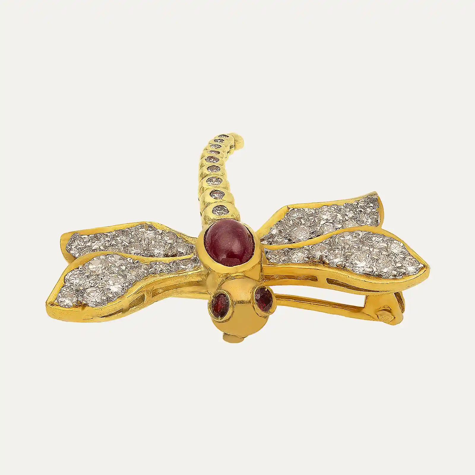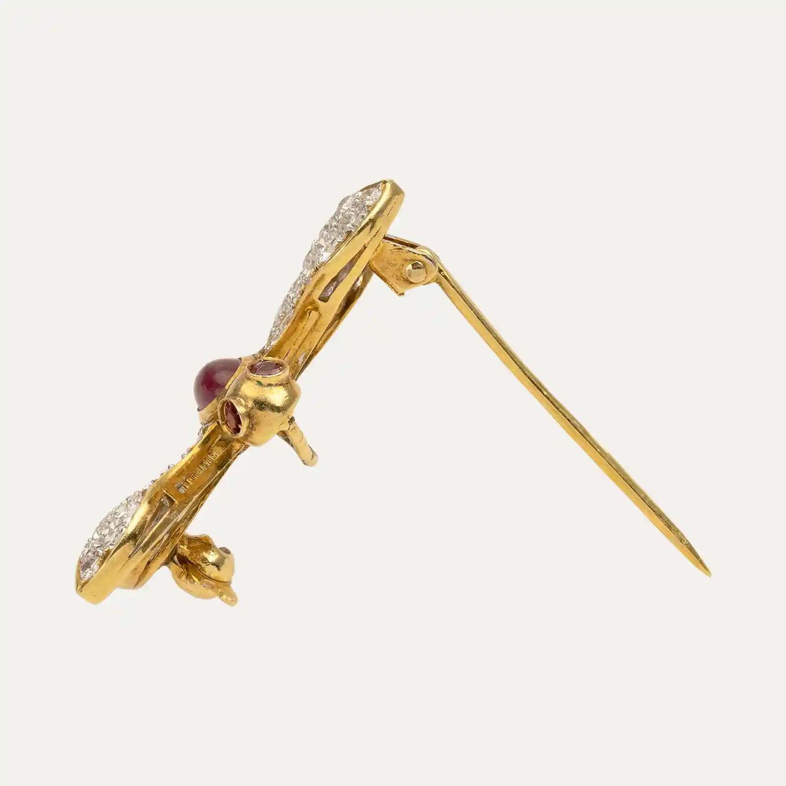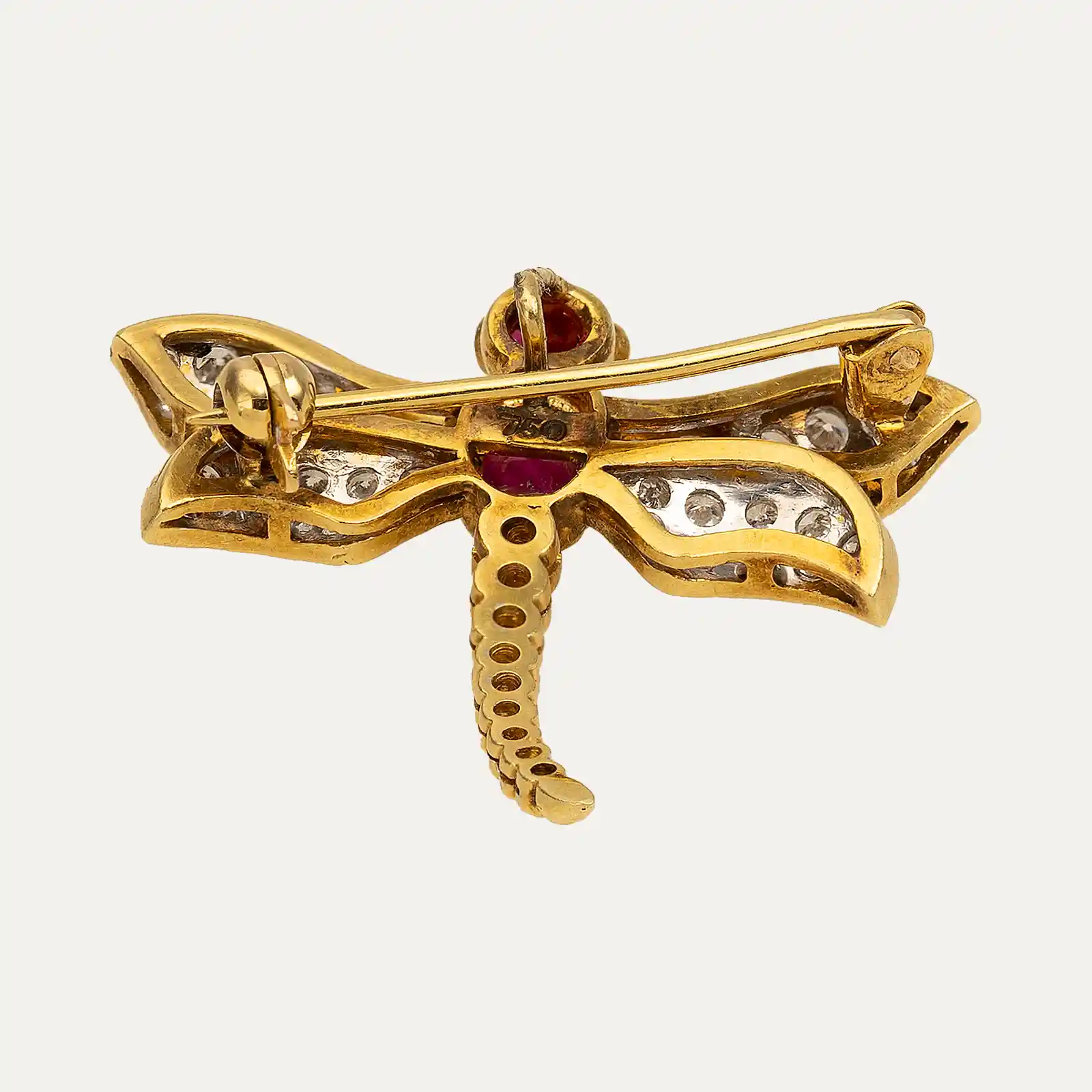 Pregadeira em ouro amarelo de 14kt – 585‰, em forma de libélula, com as asas e a cauda cravejadas de 45 diamantes. O corpo é composto por um rubi oval em lapidação cabochon ao centro, enquanto a cabeça é adornada com 2 rubis lapidados.