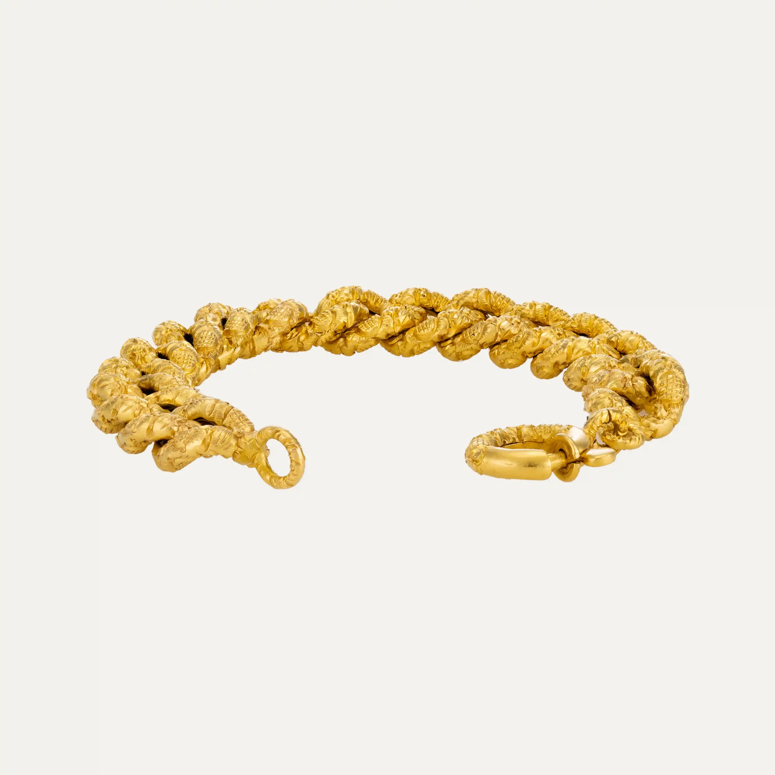 Pulseira em ouro amarelo cinzelado de 19,2 kt – 800 ‰, composta por elos largos e entrelaçados, meticulosamente trabalhados com finos detalhes artesanais. Cada elo exibe delicadas gravuras e relevos ornamentais que demonstram o domínio da técnica de cinzelagem, conferindo à peça textura, profundidade e brilho. O tom quente do dourado realça o carácter luxuoso desta criação, que une a força do design à sofisticação da ourivesaria tradicional. Fecho com argola de mola.