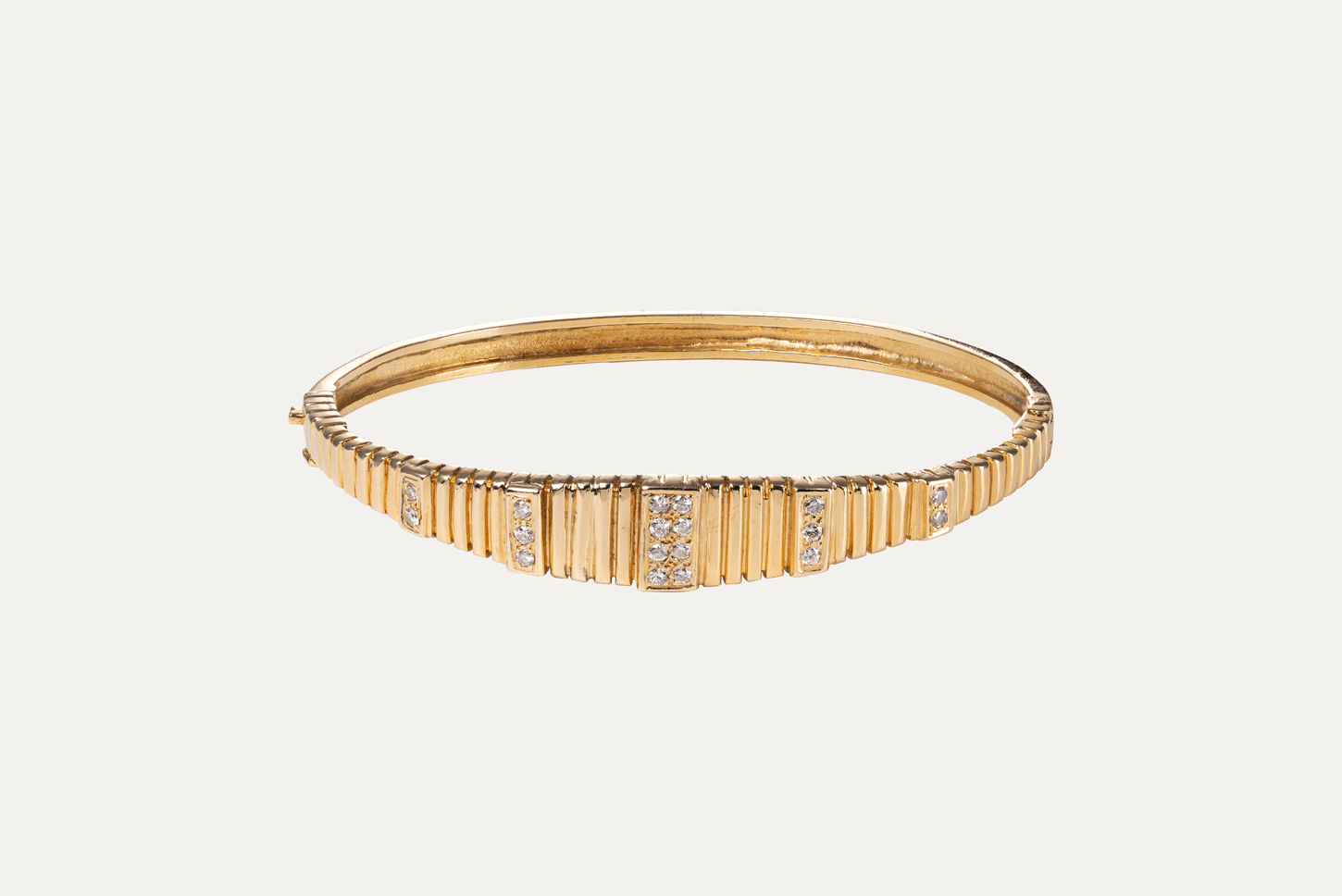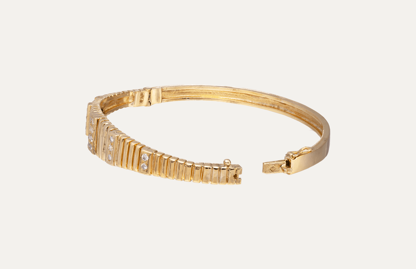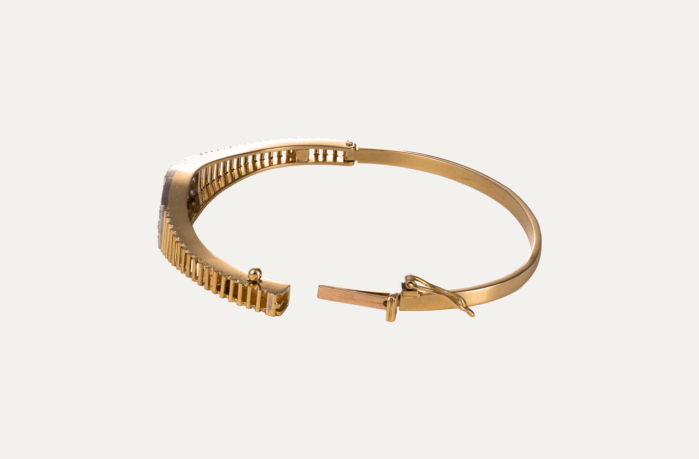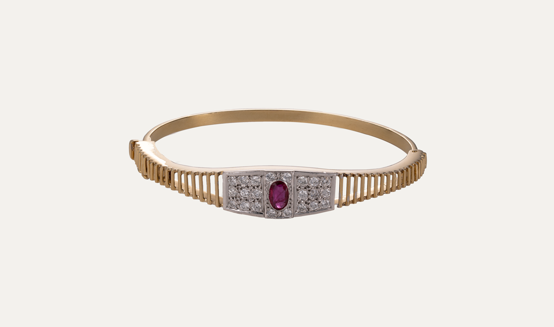 Pulseira oval rí­gida em ouro amarelo de 18kt – 750‰, 1 rubi com 0.31ct e 22 diamantes com cerca de 1.10ct no total. Abertura lateral com fecho de palheta de segurança “8”. Diâmetro interno: 5.5cm