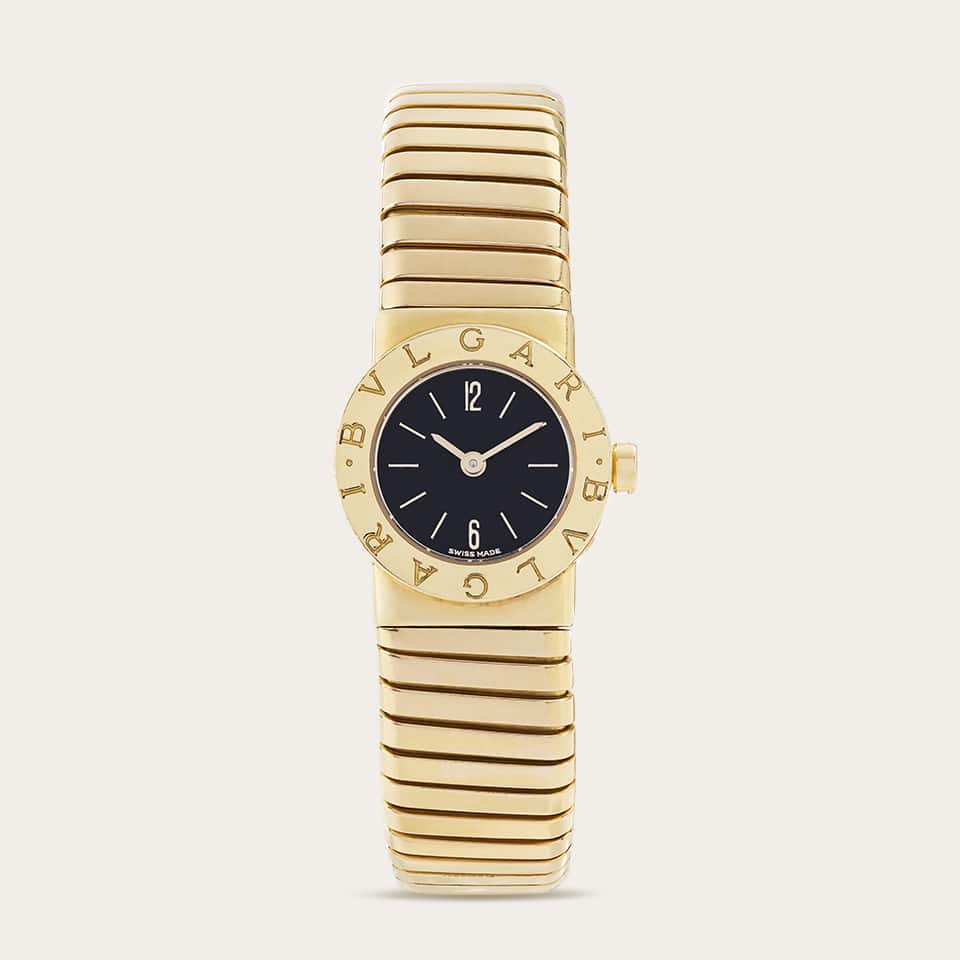 Relógio de pulso de senhora em ouro amarelo 18 kt – 750‰. Pesa 64,6g. Assinado Bulgari
