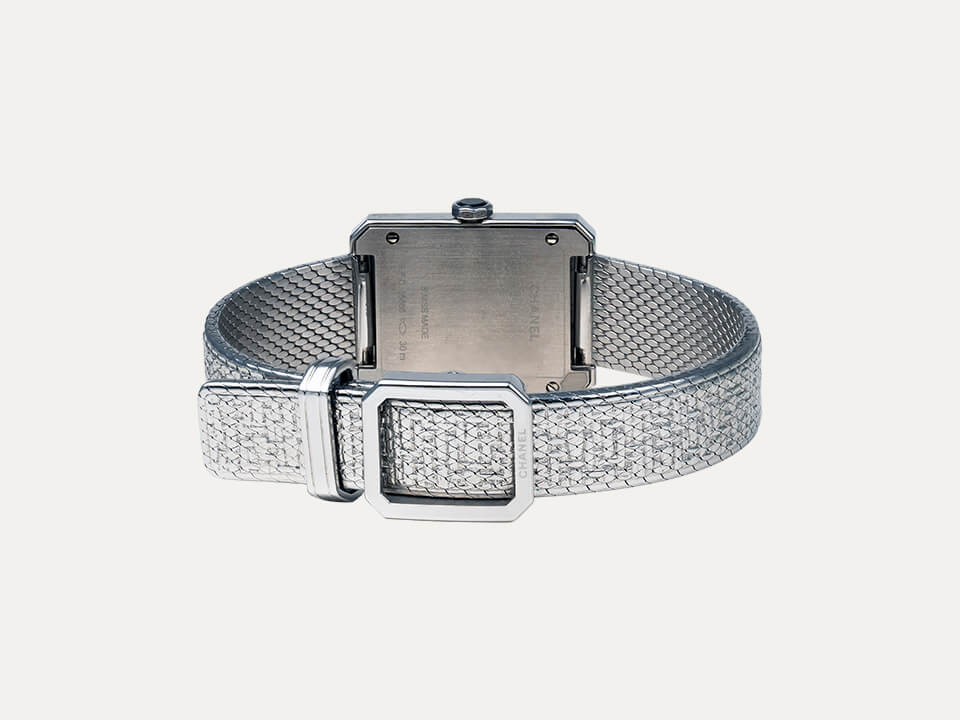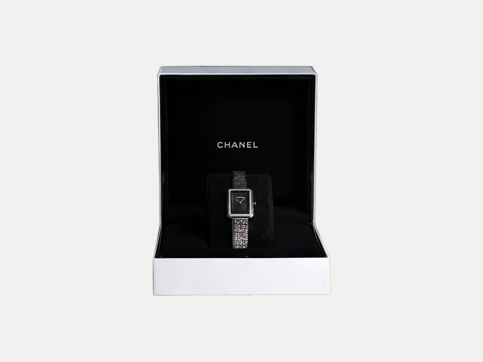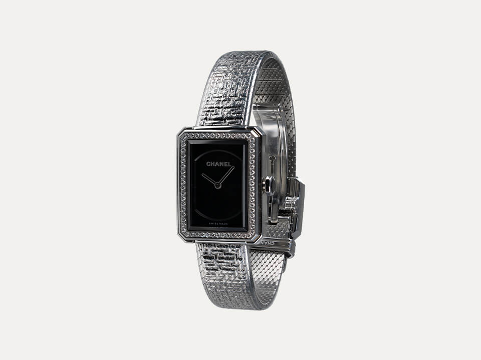 Relógio Chanel Boy-Friend com movimento quartzo. Caixa em aço e luneta em aço cravejada com 62 diamantes, 27.9mm x 21.5mm e com 6.2mm de espessura. Mostrador preto guilloché, ponteiros de horas e minutos. Coroa em aço com cabochão de espinela preto. Bracelete em aço com motivo tweed, báscula simples com fivela. Ano 2021. Caixa original Chanel e documentos. Este relógio é apoiado pela nossa garantia de um ano.