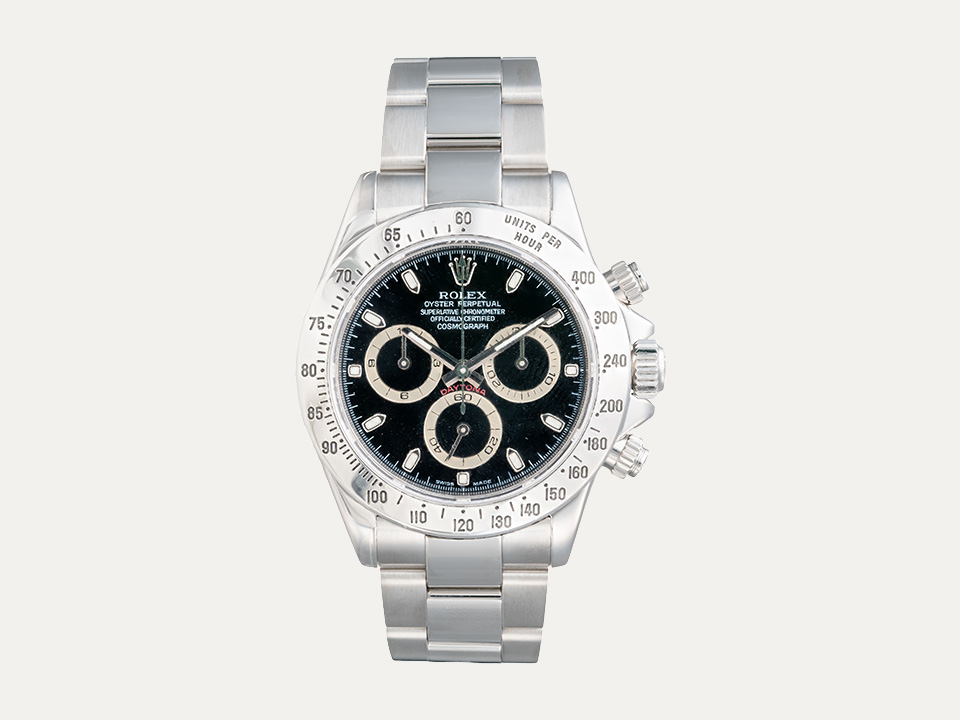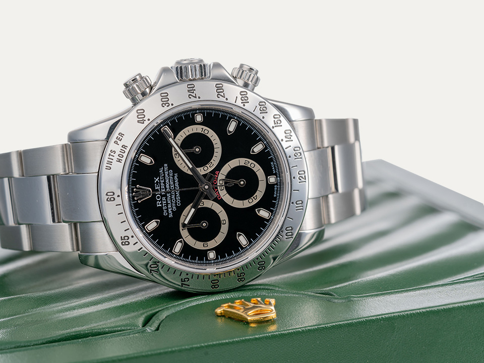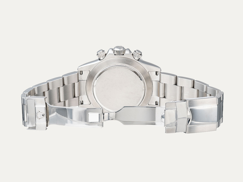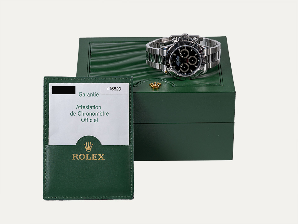 Relógio Rolex Daytona cronógrafo, movimento automático, caixa em aço, com 40mm de diâmetro e espessura 12.4 mm. Mostrador preto com índex luminescentes. Ponteiros luminescentes de horas e minutos. Cronografo e escala taquimétrica. Coroa de rosca com reserva de marcha de 72 horas. Vidro de safira. Bracelete em aço e fecho de báscula. Contém um elo suplente. Certificado COSC. Certificado “The Watch Register”. Caixa Rolex e documentos. Este relógio é apoiado pela nossa garantia de um ano.